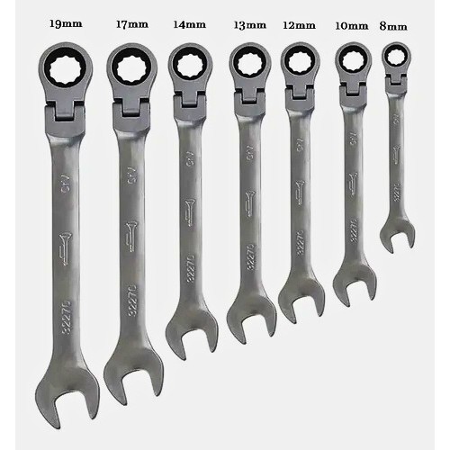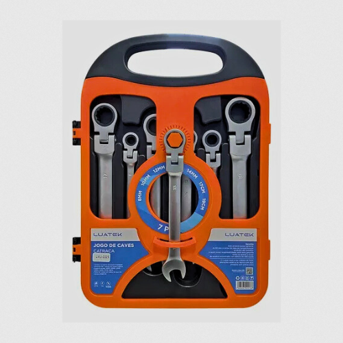 O kit é composto por 7 chaves combinadas que abrangem medidas de 8mm a 19mm, atendendo às necessidades mais comuns de aperto e desaperto de porcas e parafusos. Cada chave possui um lado com boca fixa e outro com catraca estriada, que permite agilidade no uso sem a necessidade de retirar a ferramenta a cada giro, oferecendo maior conforto e rapidez.