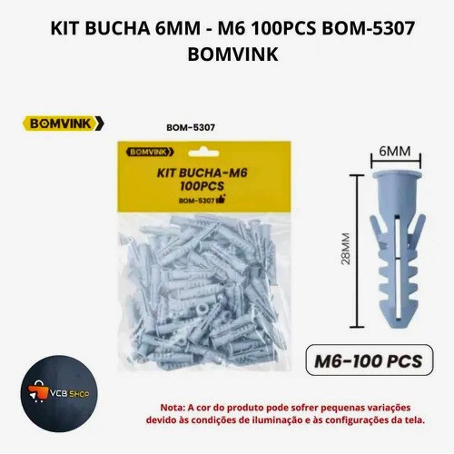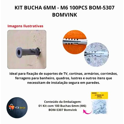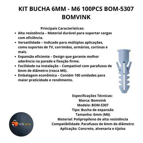 O Kit Bucha M6 BOM-5307 é composto por 100 unidades de buchas plásticas de alta qualidade, projetadas para oferecer segurança e firmeza em diversos tipos de fixações. Ideal para uso em paredes de alvenaria, concreto e tijolo, proporciona um excelente desempenho em instalações residenciais, comerciais e industriais.