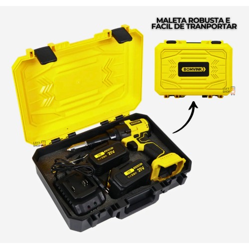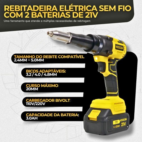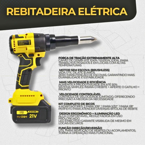 A Rebitadeira Elétrica Sem Fio 21V Pro Brushless é uma ferramenta profissional projetada para proporcionar praticidade, eficiência e precisão em trabalhos de fixação com rebites. Com motor brushless, oferece maior durabilidade, desempenho constante e menor aquecimento, garantindo uso prolongado sem perda de potência.