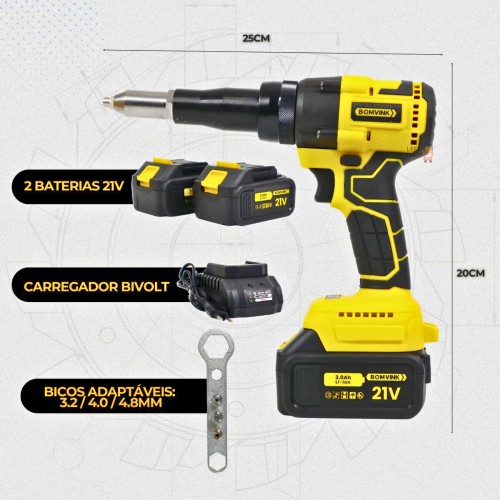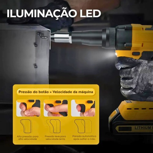 Funciona sem fio, alimentada por bateria recarregável de 21V, permitindo mobilidade total e uso em locais sem acesso a energia elétrica. Possui 4 bicos intercambiáveis, compatíveis com diferentes tamanhos de rebites, e LED frontal, que ilumina a área de trabalho para maior precisão, mesmo em ambientes com pouca luz.