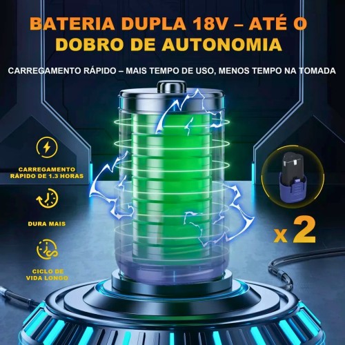 O modelo acompanha baterias recarregáveis de longa duração, além de carregador bivolt, assegurando praticidade no uso contínuo. Acompanha também acessórios de polimento e lixamento, ampliando sua versatilidade para diferentes aplicações.