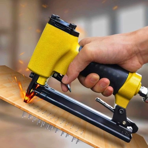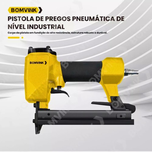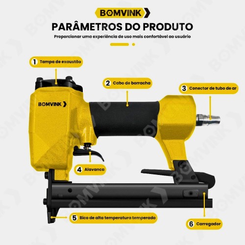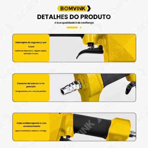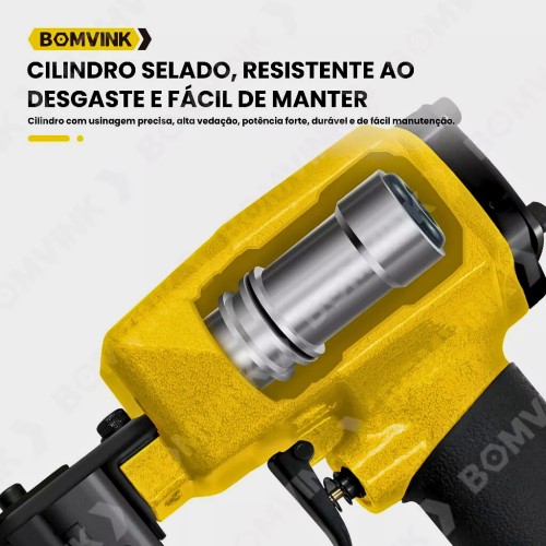 Fabricado em corpo de alumínio resistente, combina leveza e durabilidade, garantindo conforto no uso prolongado sem comprometer a performance. O gatilho ergonômico proporciona disparos rápidos e suaves, enquanto o sistema pneumático assegura força constante e uniforme em cada fixação.