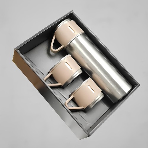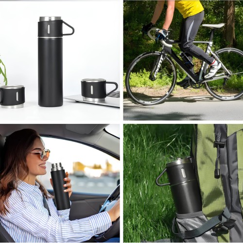 Apresentamos o Kit Garrafa Térmica Vacuum Flask Set 500ml com 3 Xícaras Inclusas, o companheiro ideal para quem ama desfrutar de bebidas quentes ou frias em qualquer lugar. Com sua tecnologia de isolamento a vácuo, este produto mantém a temperatura da sua bebida por horas, seja ela quente ou fria.