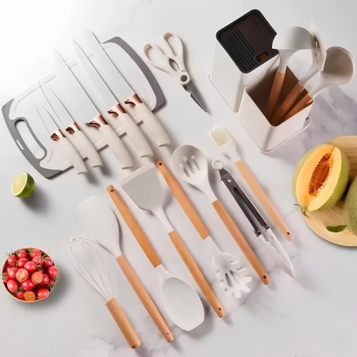 Ferramentas de Cozinha Abrangentes: O conjunto de 19 peças inclui uma variedade de ferramentas de cozinha, atendendo a diversas necessidades, desde cozinhar até assar, proporcionando praticidade.