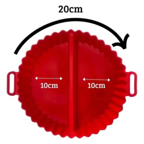 Trata-se de uma forma redondoa de silicone com divisória, ideal para uso em airfryers padrão.