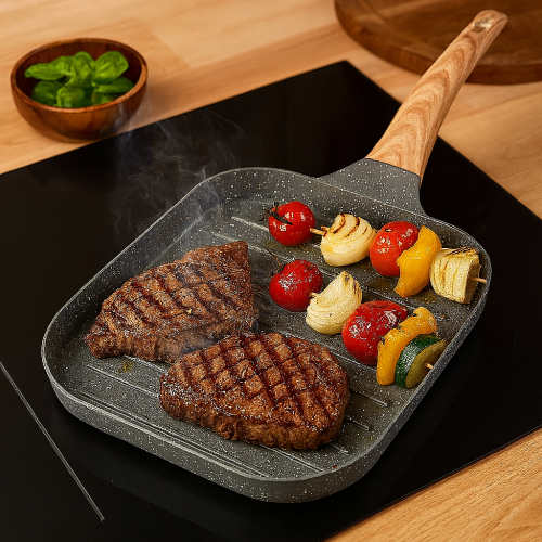 Design ergonômico: projetada com uma alça ergonômica, esta chapa oferece uma aderência confortável e permanece fria ao toque durante o cozimento, melhorando a segurança e o controle na cozinha.
