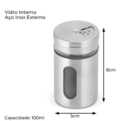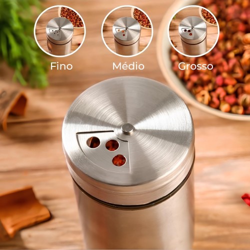 O porta tempero, permite controlar da quantidade de sal que deseja. Design moderno e elegante, fica lindo complementando a decoração da sua cozinha, feito em vidro e com acabamento externo em Aço Inox com visor que permite ver o conteúdo interno. Produto resistente e com ótima durabilidade, tamanho ideal para um bom aproveitamento do saleiro. Tampa com 3 ajustes diferentes, gire a tampa para mudar a abertura, sendo 1,5mm os menores furos, 4mm furos médios e 5mm furos grandes, assim fica fácil regular a quantidade de sal e ajustar o tamanho quando necessário