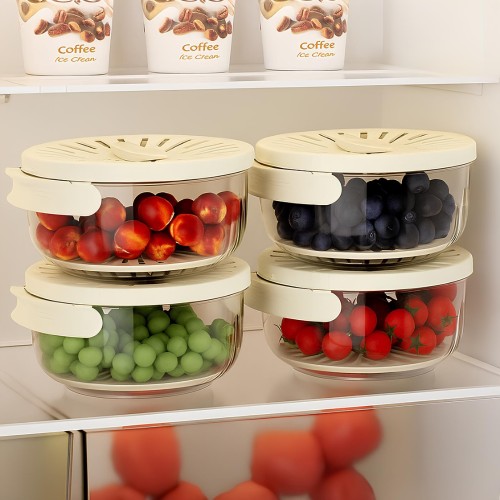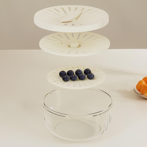 A tampa do recipiente de armazenamento de alimentos possui um design oco, com um botão para abrir ou fechar, o que torna a lavagem e drenagem de frutas e vegetais mais práticas. O design de drenagem na parte inferior garante que as frutas não fiquem imersas na água.