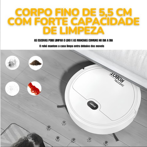 Com o Robô Aspirador de Pó Automático, a limpeza do dia a dia nunca foi tão simples e eficiente. Elegante, compacto e confiável, ele é o parceiro perfeito para uma casa sempre limpa, sem esforço.