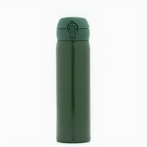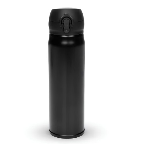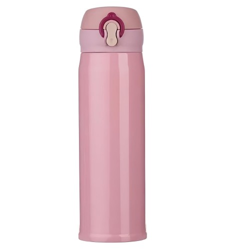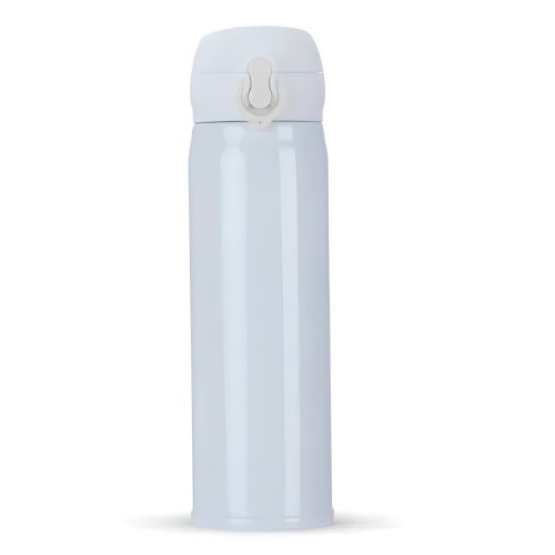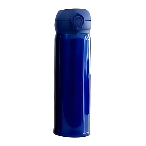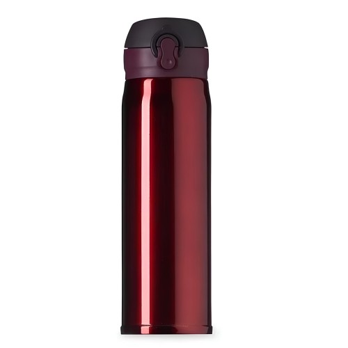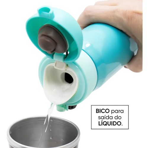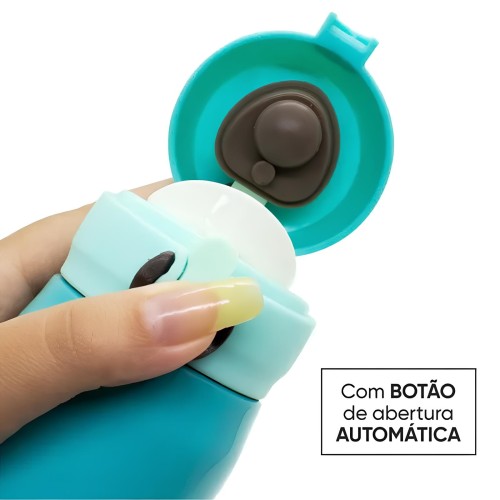 Garrafa térmica de 400ml de inox colorida com botão e válvula para abertura. Possui um sistema de trava (basta mover para cima/baixo para abrir/fechar), pressione o botão central para abrir a tampa(possui na parte interna borracha protetora evitando vazar o líquido). Para abrir a tampa por completo basta rosqueá-la, parte interna revestida em inox.