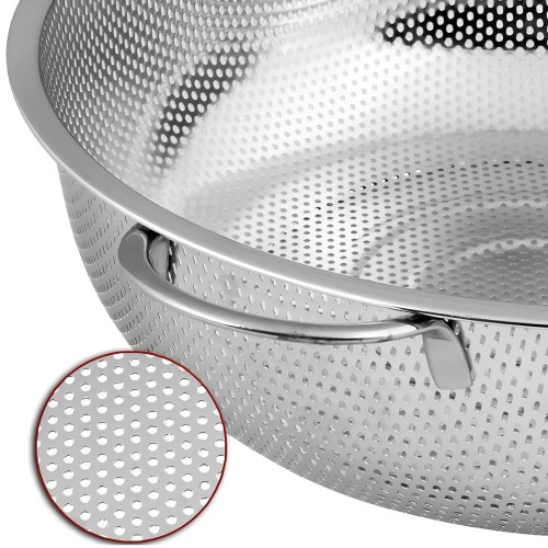 O design versátil permite que você o utilize tanto para escorrer alimentos quanto como um recipiente para lavar e preparar ingredientes. As alças laterais proporcionam um manuseio seguro e confortável, enquanto os furos distribuídos uniformemente garantem uma drenagem rápida e eficiente.