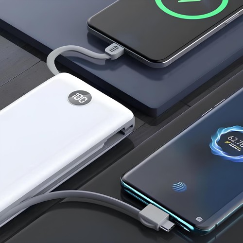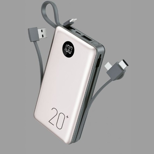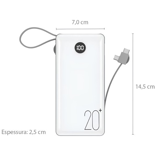 - Carregador com perfeita apresentação, moderno, com cabos embutidos, visor em LED e cabos embutidos com alça. Com ele, você garante bateria sempre que precisar, com a incrível capacidade de 20.000mAh, que irá te proporcionar bateria sempre que precisa, e compatível com todas as marcas e modelos. Com muita facilidade para o uso, ele acompanha cabos entradas Tipo-C, Micro-USB, Lightning (iPhone), e entradas USB, podendo carregar vários dispositivos ao mesmo tempo.