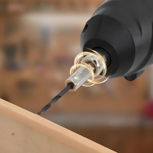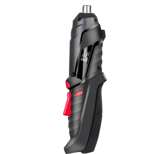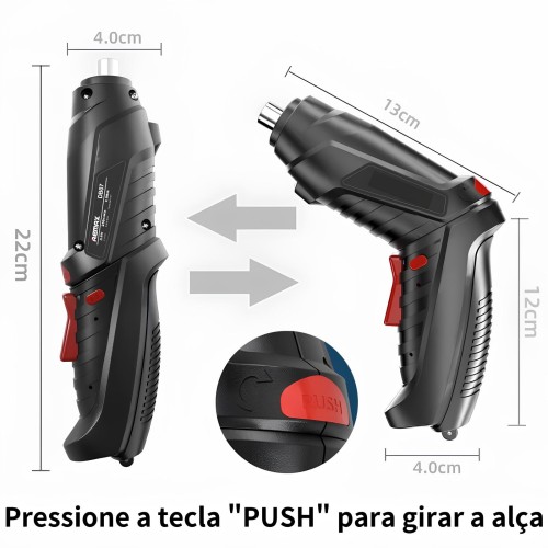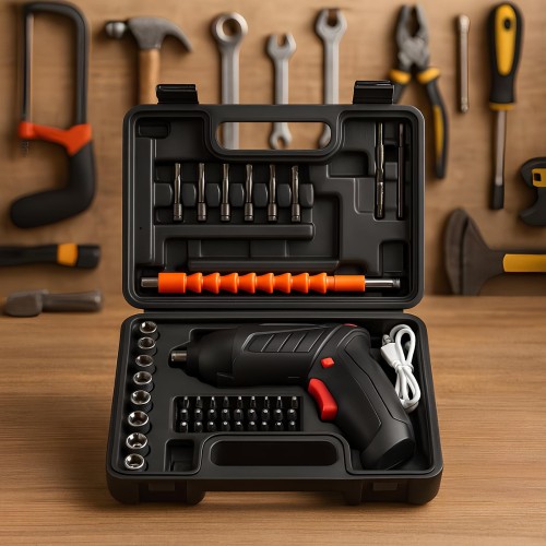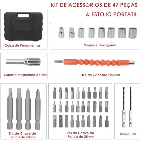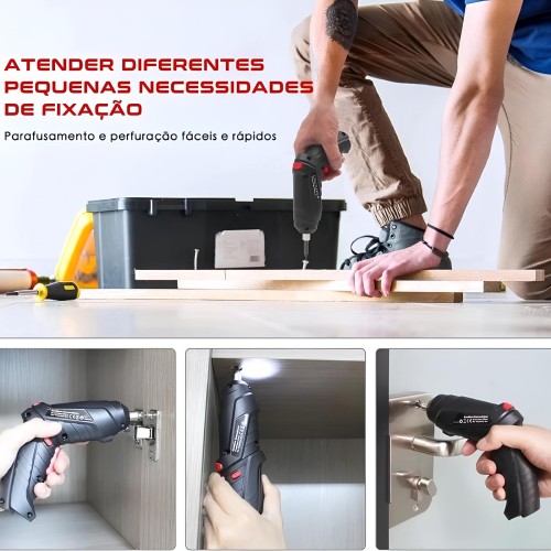 Parafusadeira elétrica portátil com cabo emborrachado para melhor ergonomia e empunhadura. Acompanha jogo de bits, soquetes, adaptador flexível e brocas, tudo organizado em maleta plástica resistente, ideal para trabalhos domésticos e pequenos reparos.