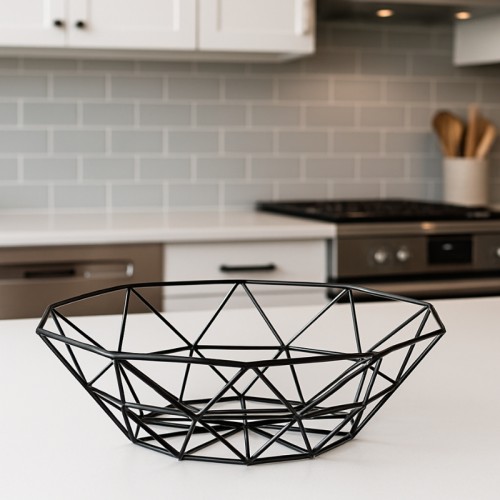 A Fruteira MMCYGP combina estilo e praticidade para decorar sua casa com elegância. Sua estrutura em fios metálicos vazados, com design geométrico contemporâneo, valoriza o visual das frutas, deixando-as organizadas e bem expostas.