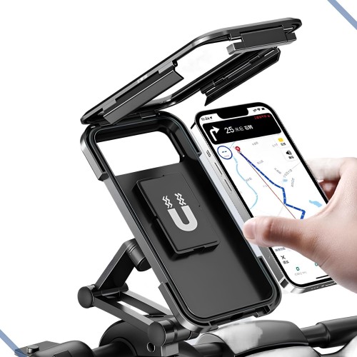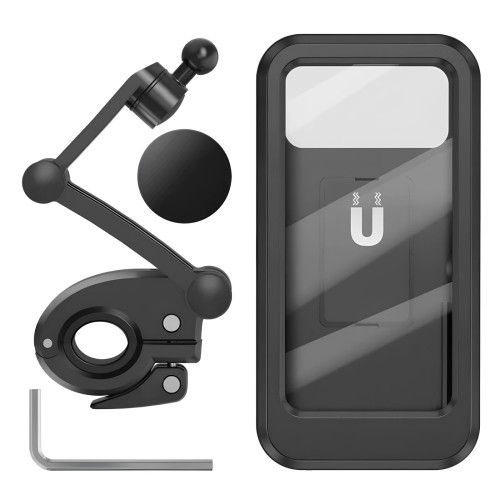 O suporte tem uma excelente fixação no guidão com uma trava de segurança super rígida. Na parte interna possui um super ímã deixando o aparelho estável e seguro dentro da case. Para maior proteção, o suporte é vedado com dupla camada de borracha para impossibilitar a entrada de água.